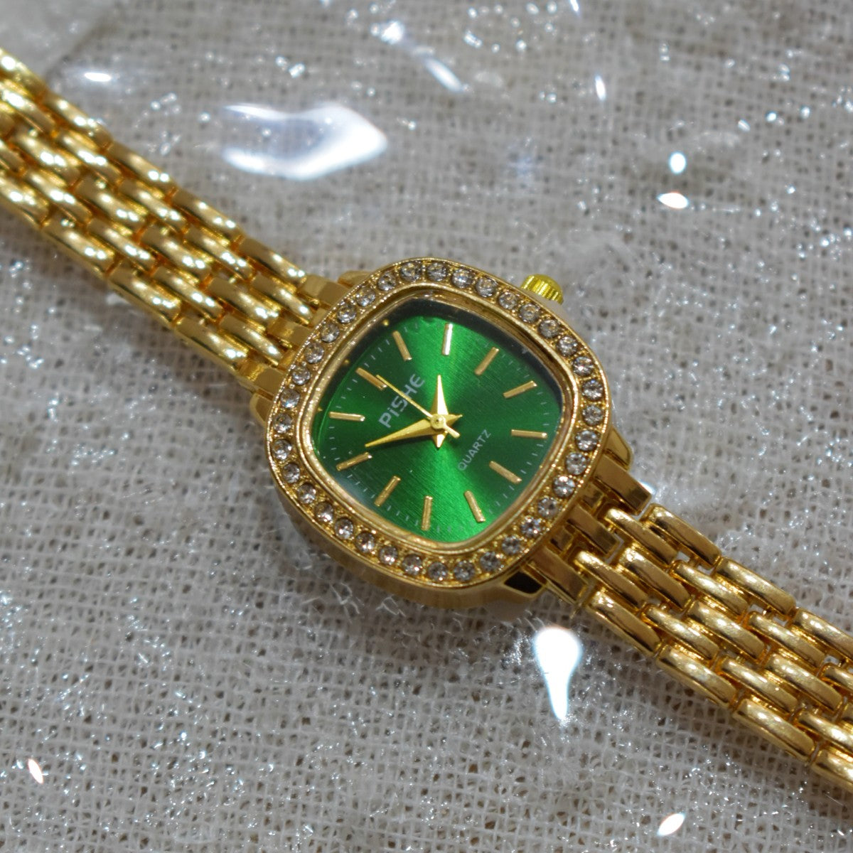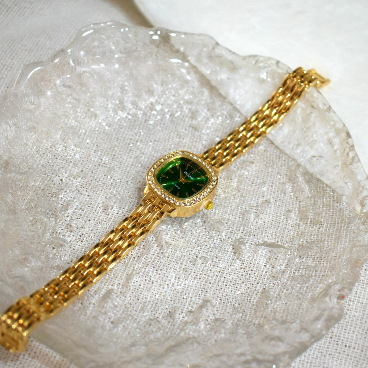 Κομψό γυναικείο ρολόι με χρυσό μεταλλικό μπρασελέ και εντυπωσιακό πράσινο καντράν, που προσθέτει μια elegant πινελιά σε κάθε εμφάνιση.