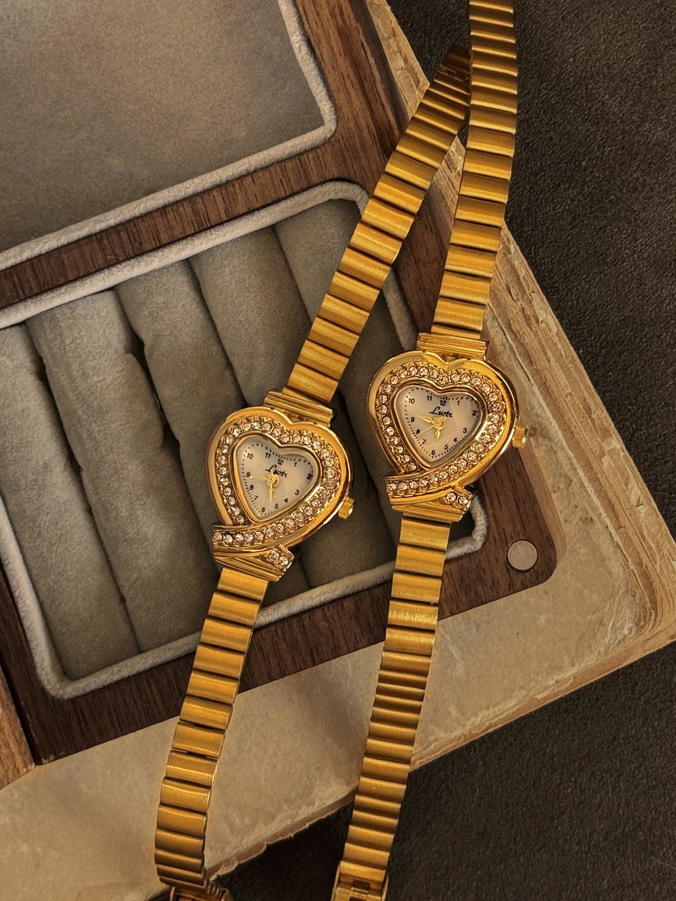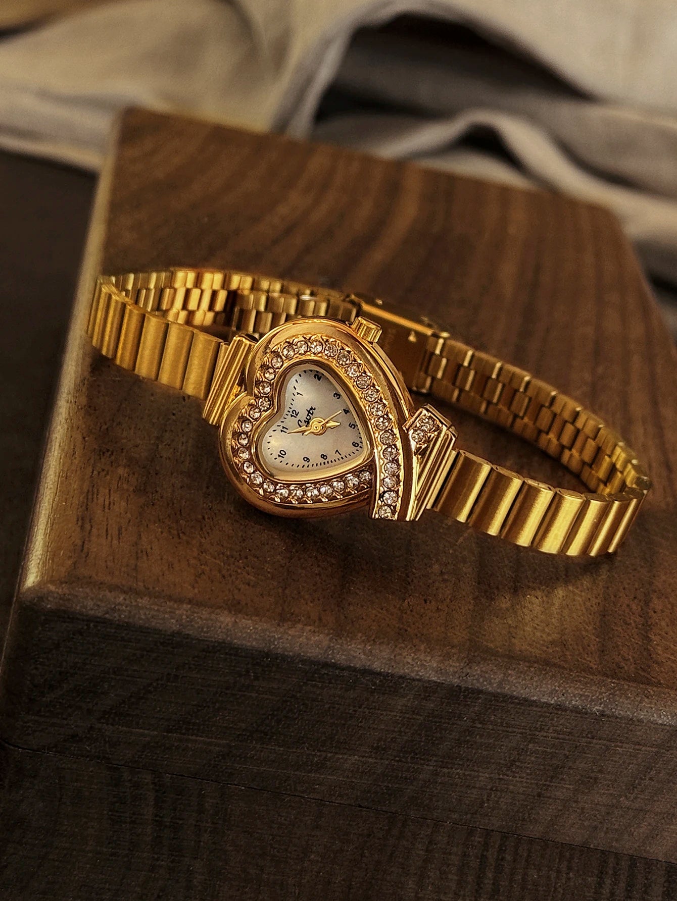 Ένα κομψό και ρομαντικό γυναικείο ρολόι με χρυσό μπρασελέ και κάσα σε σχήμα καρδιάς, διακοσμημένη με λαμπερά ζιργκόν περιμετρικά. Το λευκό καντράν με χρυσαφί δείκτες προσδίδει διακριτική πολυτέλεια, ενώ το χρυσό μπρασελέ ολοκληρώνει το εκλεπτυσμένο στυλ. Ιδανικό για ξεχωριστές εμφανίσεις αλλά και ως δώρο αγάπης που θα μείνει αξέχαστο.