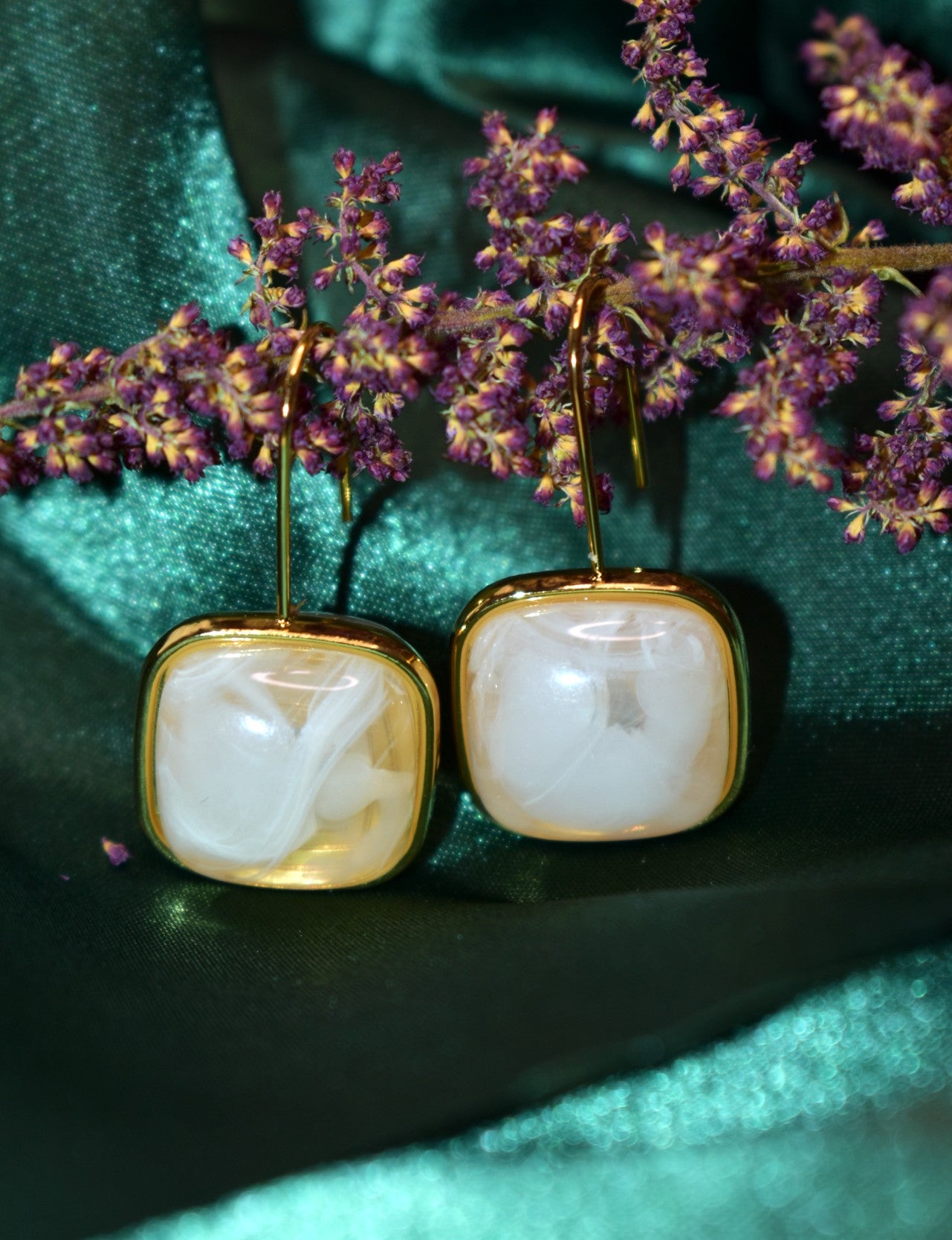 Η τετράγωνη, ιριδίζουσα πέτρα θυμίζει μαργαριτάρι και αναδεικνύεται υπέροχα μέσα στο γυαλιστερό χρυσό πλαίσιο, δημιουργώντας μια αίσθηση διακριτικής πολυτέλειας.